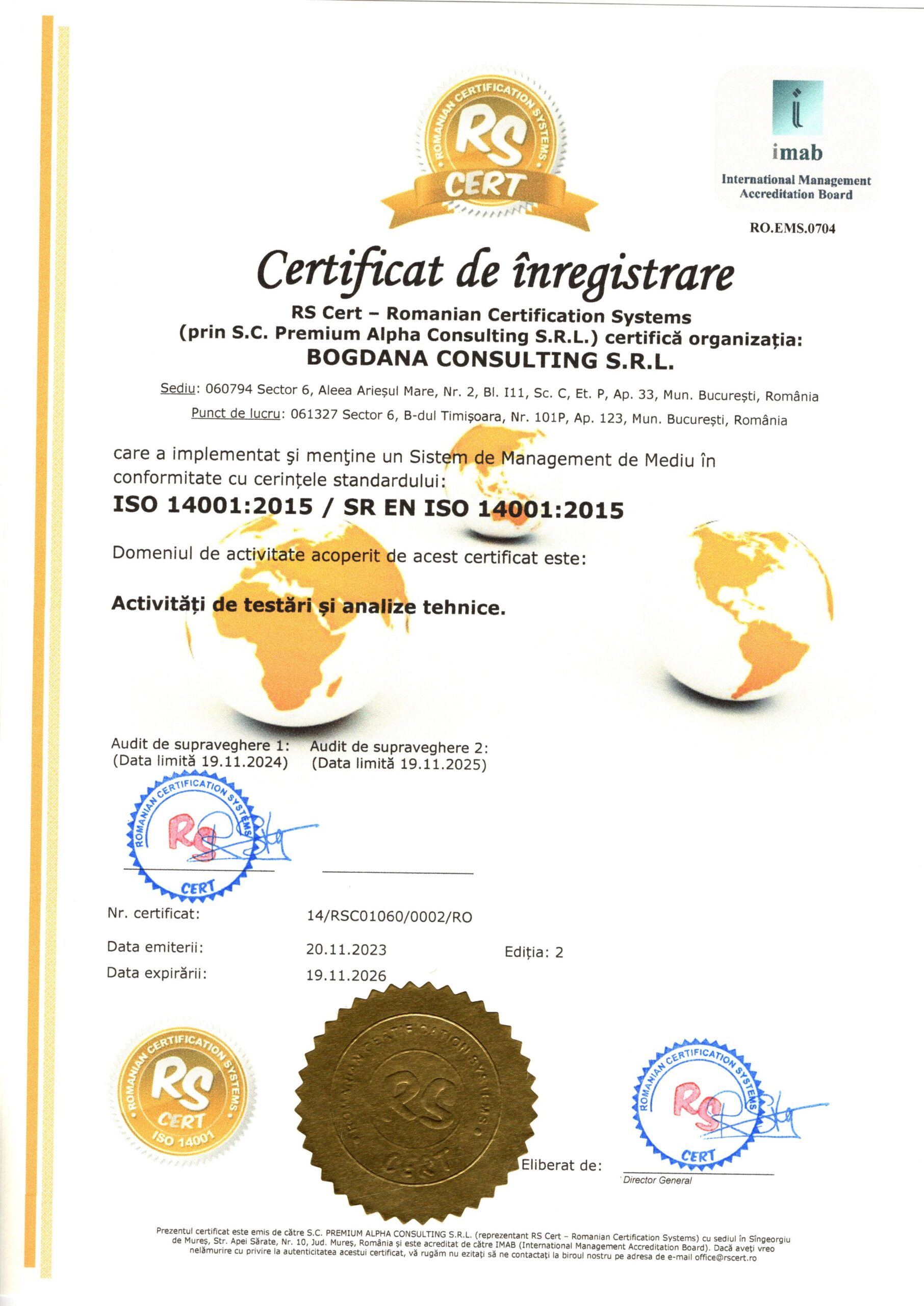 Laboratorul de mediu din cadrul SC Bogdana Consulting SRL, isi desfasoara activitatea in baza Certificatului de ablitare nr. 192/20.06.2019, emis de Ministerul Sanatatii prin Institutul National de Sanatate Publica .