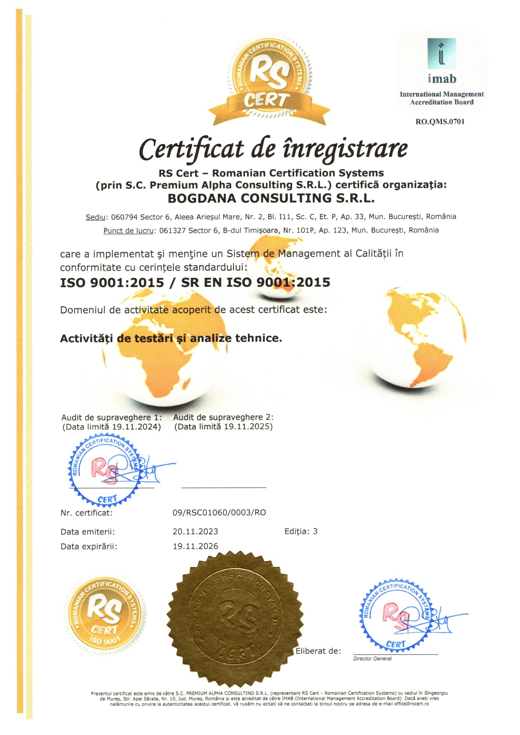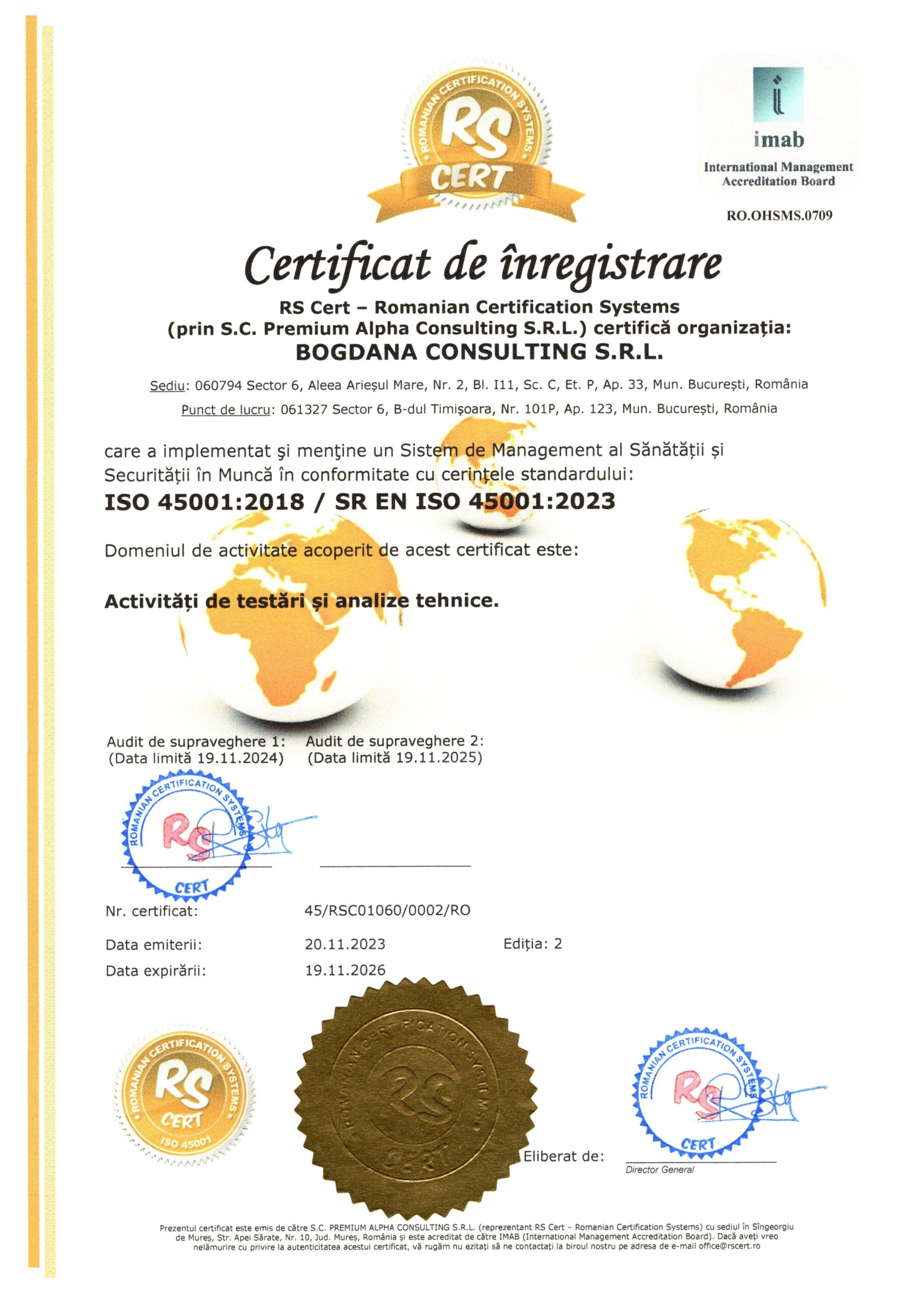SC Bogdana Consulting S.R.L, este o societate cu capital integral privat, infiintata in anul 2004, avand ca obiect de activitate efectuarea de testari si analize tehnice .
