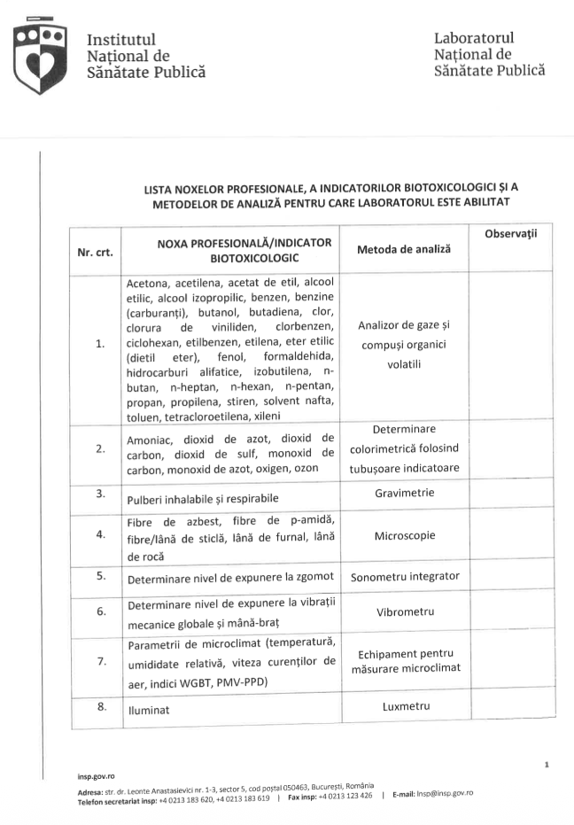 Domeniul de detrminari al Laboratorului de Toxicoligie Industriala SC Bogdana Consulting S.R.L: